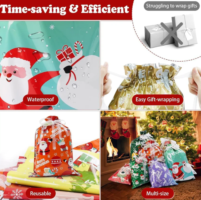 Kein Herumfrickeln mit Geschenkpapier, Klebeband und Scheren, keine Sorgen, beim Verpacken von etwas, das nur zerknüllt und weggeworfen wird, ein ordentliches Ergebnis erzielen zu müssen. Unsere Weihnachtstaschen kommen mit hübschen Bändern, die Ihnen helfen können, die Dinge schnell zu verstauen und Ihren Geschenken ein schönes, fertiges Aussehen zu verleihen.