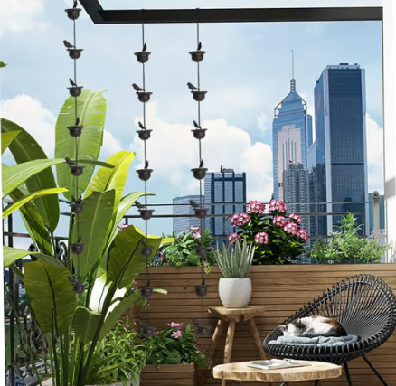 Funktional und dekorativ: Diese kaskadenförmige Regenkette ist eine beeindruckende Alternative zu herkömmlichen Fallrohren. Regenwasser flieĂt sanft von einem Vogelbad zum nĂ€chsten und erzeugt einen natĂŒrlichen Wasserfalleffekt, der sowohl optisch als auch akustisch beruhigend wirkt.
