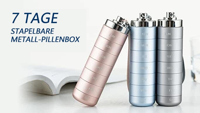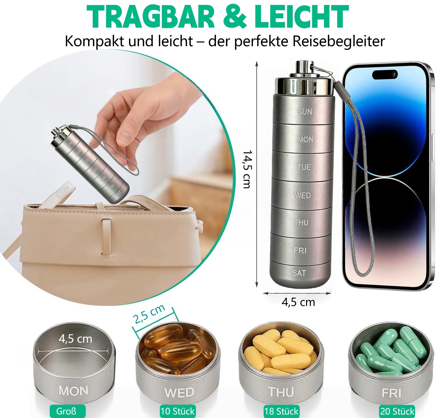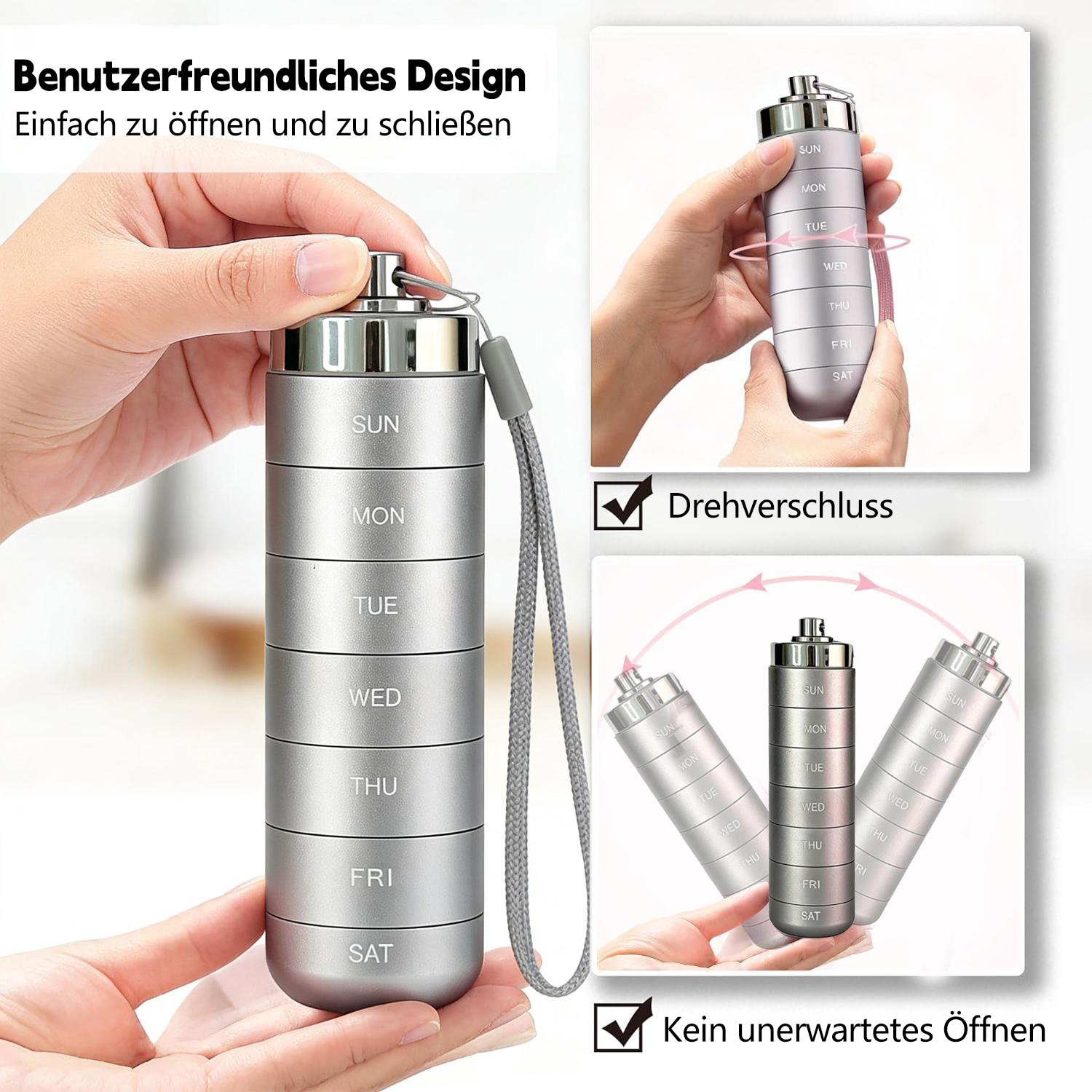 Hochwertiges medizinisches Metallmaterial: Anstelle von billigem Plastik besteht unsere Pillendose aus BPA-freiem, verstärktem und stoßfestem, robustem medizinischem Aluminium. Sie hält selbst einem Autoüberschlag stand. Verabschieden Sie sich von wackeligen Wochenpillenboxen aus Plastik und vermeiden Sie unerwartete Beschädigungen. Entscheiden Sie sich stattdessen für eine sichere und stabile Medikamentenbox.