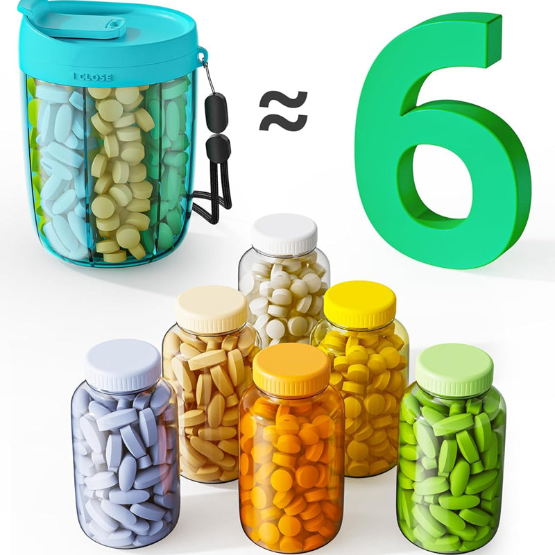 Unsere Pillenspenderflasche mit 6 Fächern wurde entwickelt, um Ihren Alltag zu vereinfachen, Stress abzubauen und Ihre Gesundheit im Griff zu behalten – alles in einem eleganten, tragbaren Design!
