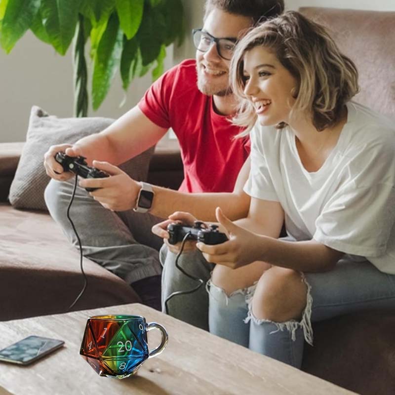 RAINBOW DICE DESIGN: Besticht durch eine auffällige D20-Würfelform in Kombination mit einem leuchtenden, auffälligen Regenbogen-Finish – verleiht jedem Schluck eine lustige, geekige Note, die sich von gewöhnlichen Trinkgefäßen abhebt.