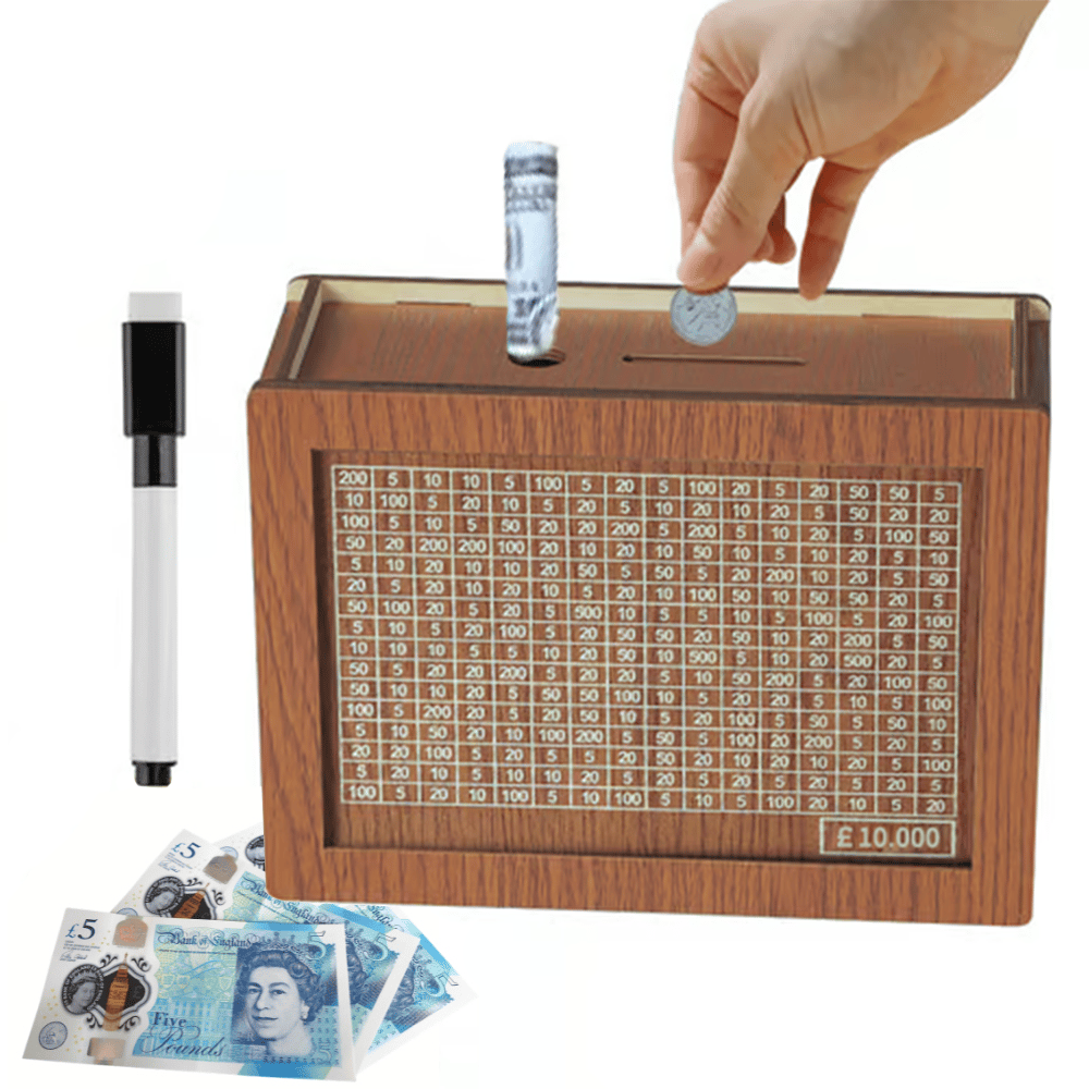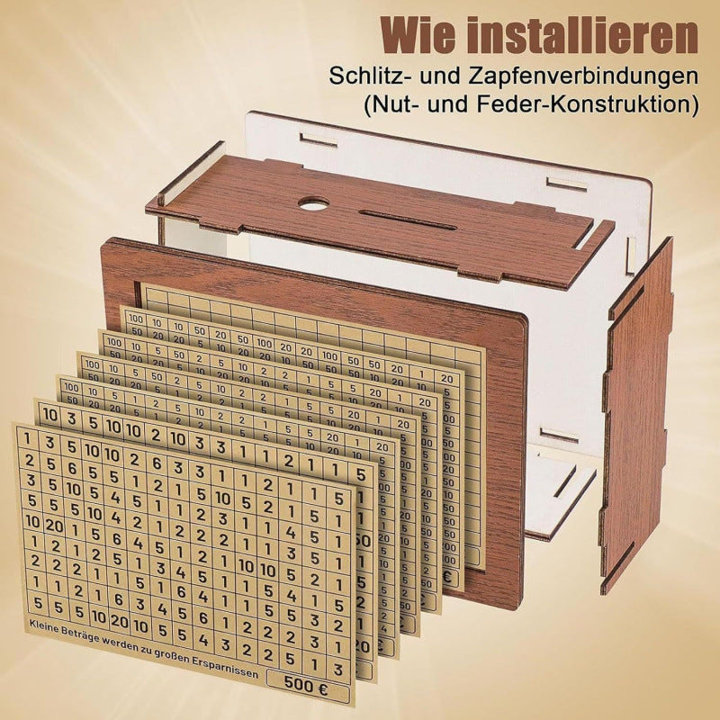 💸Überlegene Handwerkskunst: Gefertigt aus hochwertigem Holz, vereint unsere Holz-Sparbüchse Langlebigkeit mit elegantem Design. Ihre leichte und tragbare Struktur ermöglicht es, sie problemlos überall in Ihrem Zuhause zu platzieren. Jede Sparbüchse enthält einen Marker, um bequem die gesparten Beträge abzuhaken und so Ihre Sparreise zu vereinfachen.
